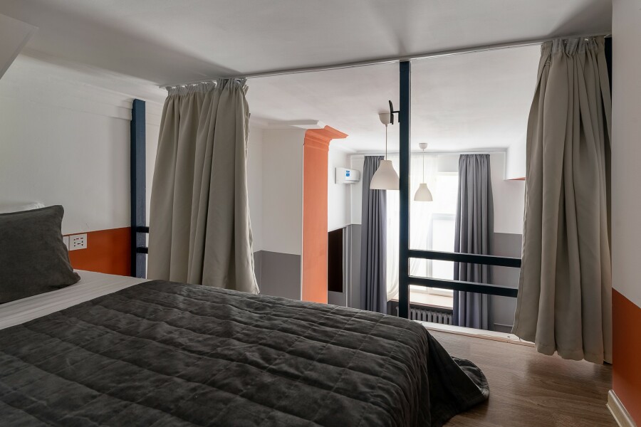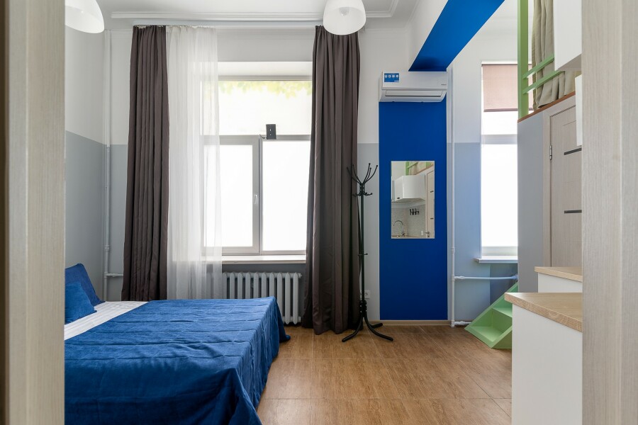 Апарт-отель в центре города без стойки регистрации. Доступ в отель осуществляется бесконтактно с помощью электронных кодовых замков. Апартаменты ЭКОНОМ класса В пешей доступности Арбат, Центральная Площадь, Кинотеатр Океан и Спортивная набережная. Все, что нужно для жизни, рядом с отелем, рестораны, салоны красоты, медцентры, развлекательные, образовательные и культурные организации. В отеле оборудована общая прачечная с круглосуточным доступом, где гости могут воспользоваться стиральной машиной, гладильными принадлежностями Номера-двухуровневые, с косметическим ремонтом. Номера в отеле +/- одинаковые с небольшой разницей в цветовом решении стен и планировкой. Мы оставляем за собой право назначить любой доступный номер и по возможности предложим вам выбор в день заезда. 2 раздельных спальных места для компаний до 4 человек. Залоговый депозит при заезде в номер 3000 руб., возвращается в день выезда.