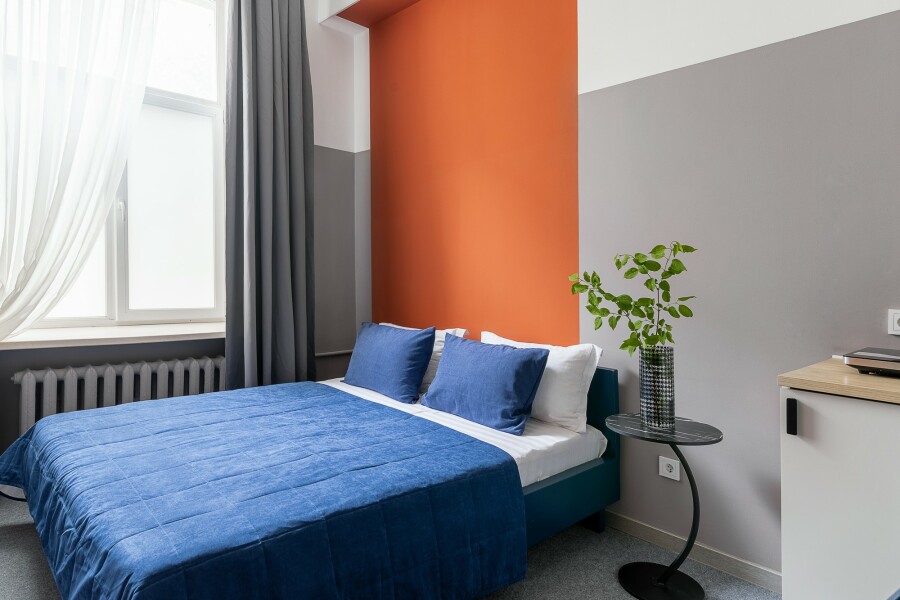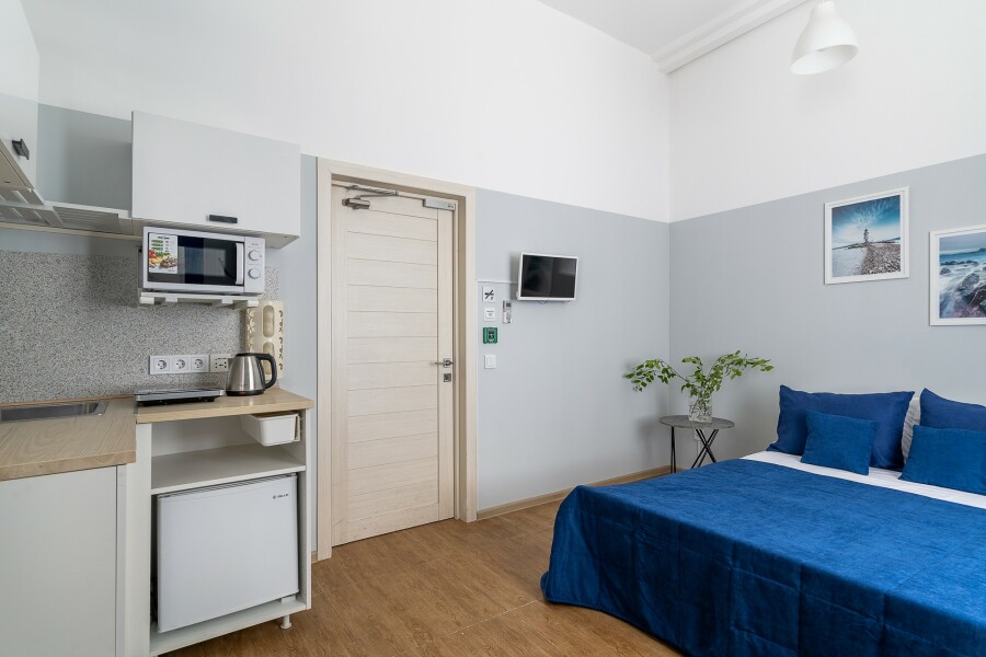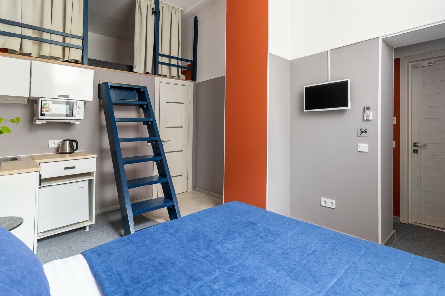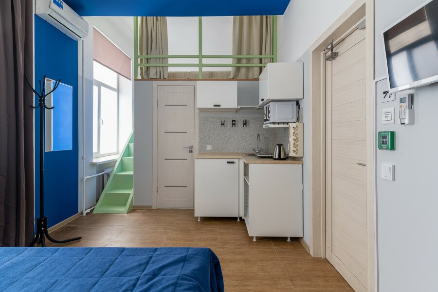 Апарт-отель в центре города без стойки регистрации. Доступ в отель осуществляется бесконтактно с помощью электронных кодовых замков. Апартаменты ЭКОНОМ класса В пешей доступности Арбат, Центральная Площадь, Кинотеатр Океан и Спортивная набережная. Все, что нужно для жизни, рядом с отелем, рестораны, салоны красоты, медцентры, развлекательные, образовательные и культурные организации. В отеле оборудована общая прачечная с круглосуточным доступом, где гости могут воспользоваться стиральной машиной, гладильными принадлежностями Номера-двухуровневые, с косметическим ремонтом. Номера в отеле +/- одинаковые с небольшой разницей в цветовом решении стен и планировкой. Мы оставляем за собой право назначить любой доступный номер и по возможности предложим вам выбор в день заезда. 2 раздельных спальных места для компаний до 4 человек. Залоговый депозит при заезде в номер 3000 руб., возвращается в день выезда.
